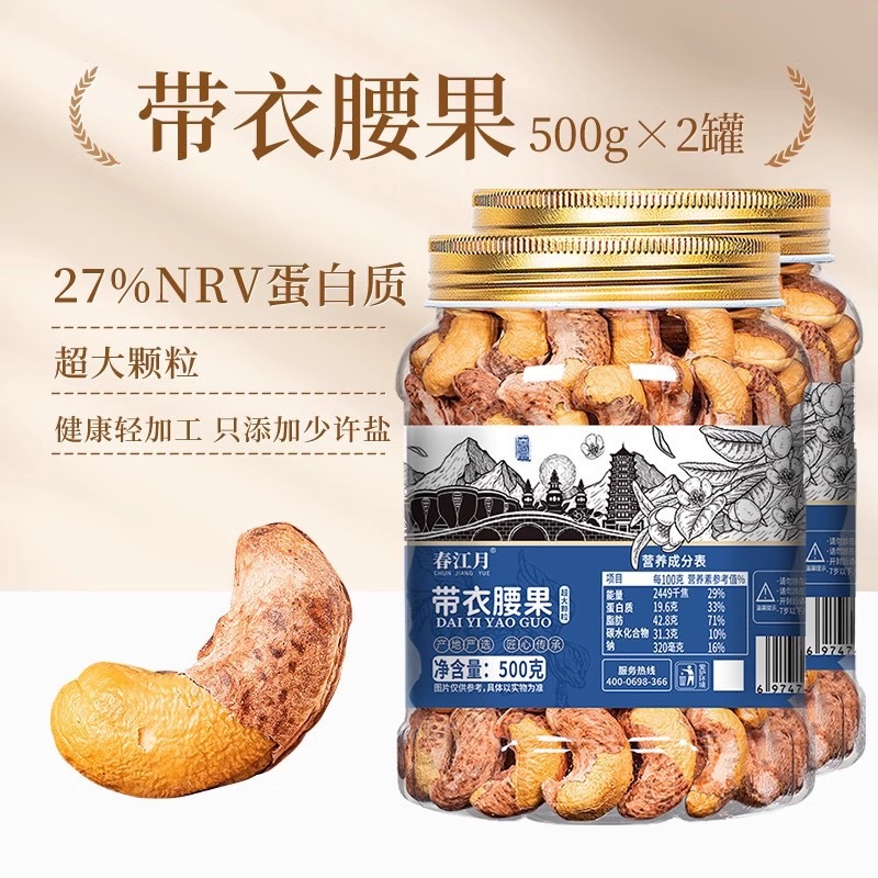 越南盐焗紫衣腰果特大颗粒原味500g*2罐